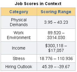 Data on each job is broken down into five key categories: Physical Demands, Work Environment, Income, Stress and Hiring Outlook. Jobs receive a score in each individual category, and when these are added together, the career with the best overall score is ranked 1st, while the one with the worst overall score is ranked 200th.