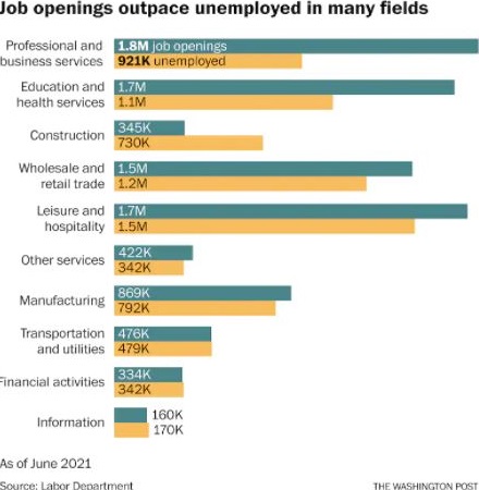 In “Why America has 8.4 million unemployed when there are 10 million job openings,” WaPo economic reporters Heather Long, Alyssa Fowers, and Andrew Van Dam point to several mismatches.
