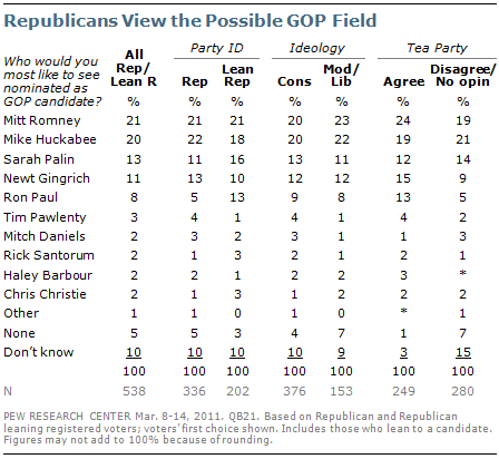 Among those who say they agree with Tea Party movement, 24% say Romney would be their first choice, 19% say Huckabee, 15% say Gingrich, 13% say Paul and 12% say Palin.