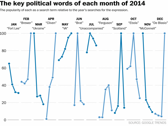 Using the Google’s Trends Tool, The Washington Post’s Philip Bump came up with this chart showing the most-searched words and phrases during each month of the past year related to political or news events, and what it tells us about how fickle the 2014 news cycle was: