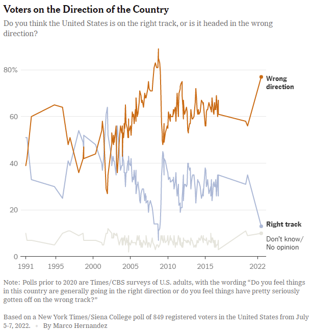 Widespread concerns about the economy and inflation have helped turn the national mood decidedly dark, both on Mr. Biden and the trajectory of the nation. More than three-quarters of registered voters see the United States moving in the wrong direction, a pervasive sense of pessimism that spans every corner of the country, every age range and racial group, cities, suburbs and rural areas, as well as both political parties.