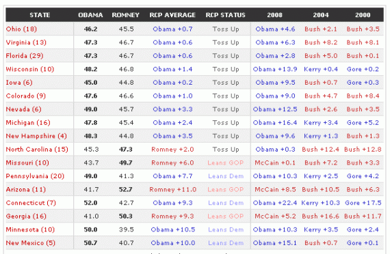 RealClearPolitics shows Obama with 221 Electoral votes to Romney’s 191, with an additional 10 states and 126 Electors as toss-ups. But look closer: