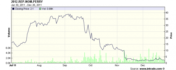 Is what we see here really any different than what you can garner from looking at your average polling graph? Coming off a September in which he was beating off a challenge from Rick Perry, Romney once again rises to the level of presumptive nominee (notwithstanding the rise of Herman Cain, who nobody viewed as a serious contender of the nomination). Then, when Newt Gingrich rises in late November, Romney plummets only to rise again when the Gingrich bubble bursts. As we stand now, Intrade is giving Romney a 70+% chance at being the Republican nominee. If anything, that seems conservative.