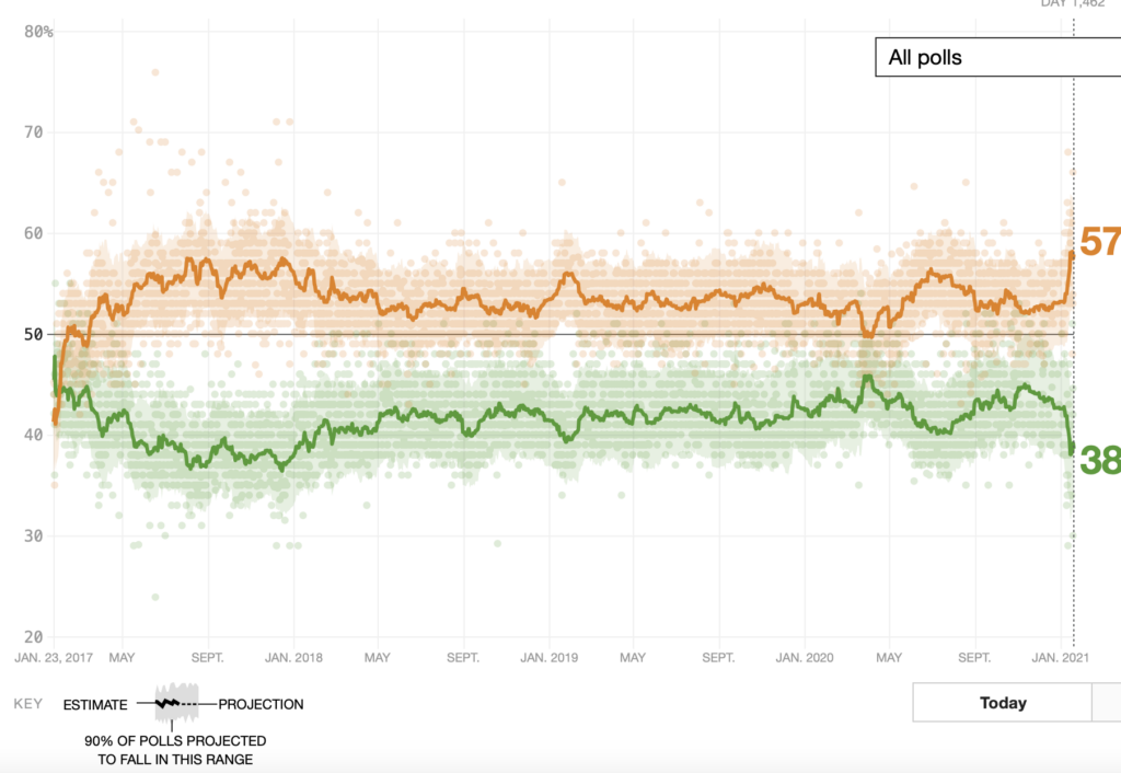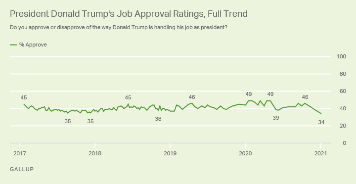 We know that Trump lost the popular vote in 2016 by 2,833,224 votes and in 2020 by 7,052,045. Note that in the Gallup poll, he never hit 50% approval (Last Trump Job Approval 34%; Average Is Record-Low 41%):