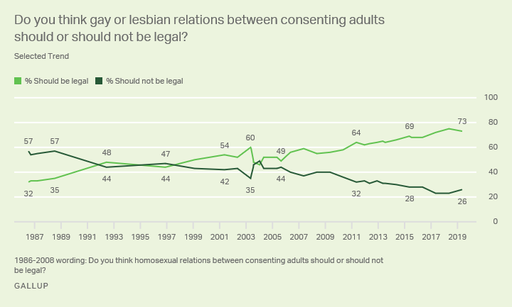In 1987, a whopping 57% of respondents believed gay relations—not marriage; relations—should be illegal. By 2019, that number had dropped to 26%, with 73% saying it should be legal.