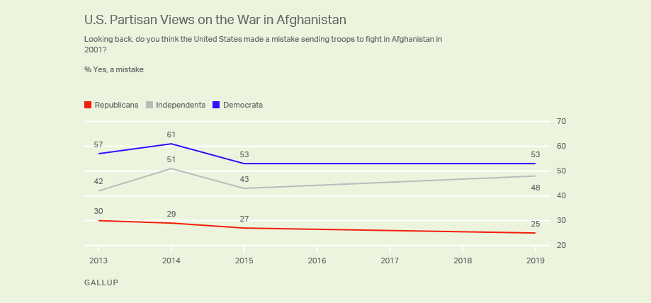 WASHINGTON, D.C. — Peace negotiations between the U.S. and Taliban negotiators collapsed this past weekend. The cancellation of the talks leaves the future of the war in Afghanistan in question, as Americans’ views of the war effort are holding steady from Gallup’s last measure, conducted four years ago, with 43% currently saying it was a mistake to send troops there and 52% saying it was not a mistake.
