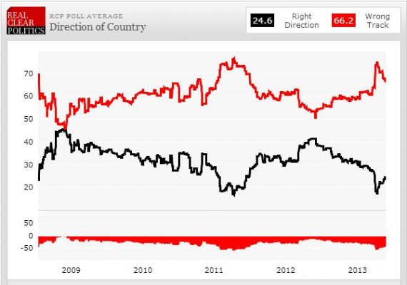 Perhaps the most interesting takeaway from the poll, though, is found in the fact that increasing numbers of the American public sees the U.S. as playing a lesser role in the role in the world today than it has in the past, and that it has lost respect in the world over the years, and they seem entirely okay with that. Does this mean that the jingoistic vision that once motivated American foreign policy in both parties, and which seems to still be a strong part of foreign policy in the Republican Party is fading away? Or, is it a reflection of a general pessimism about the direction the nation has been moving in the past decade or so? You can see that pessimism in the benchmark right track/wrong track poll, which has been harshly negative for the vast majority of the Obama Administration, this chart from RealClearPolitics shows: