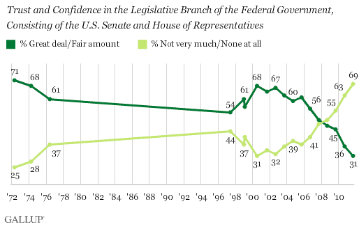 - 69% say they have little or no confidence in the legislative branch of government, an all-time high and up from 63% in 2010.