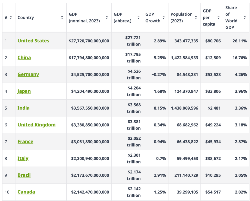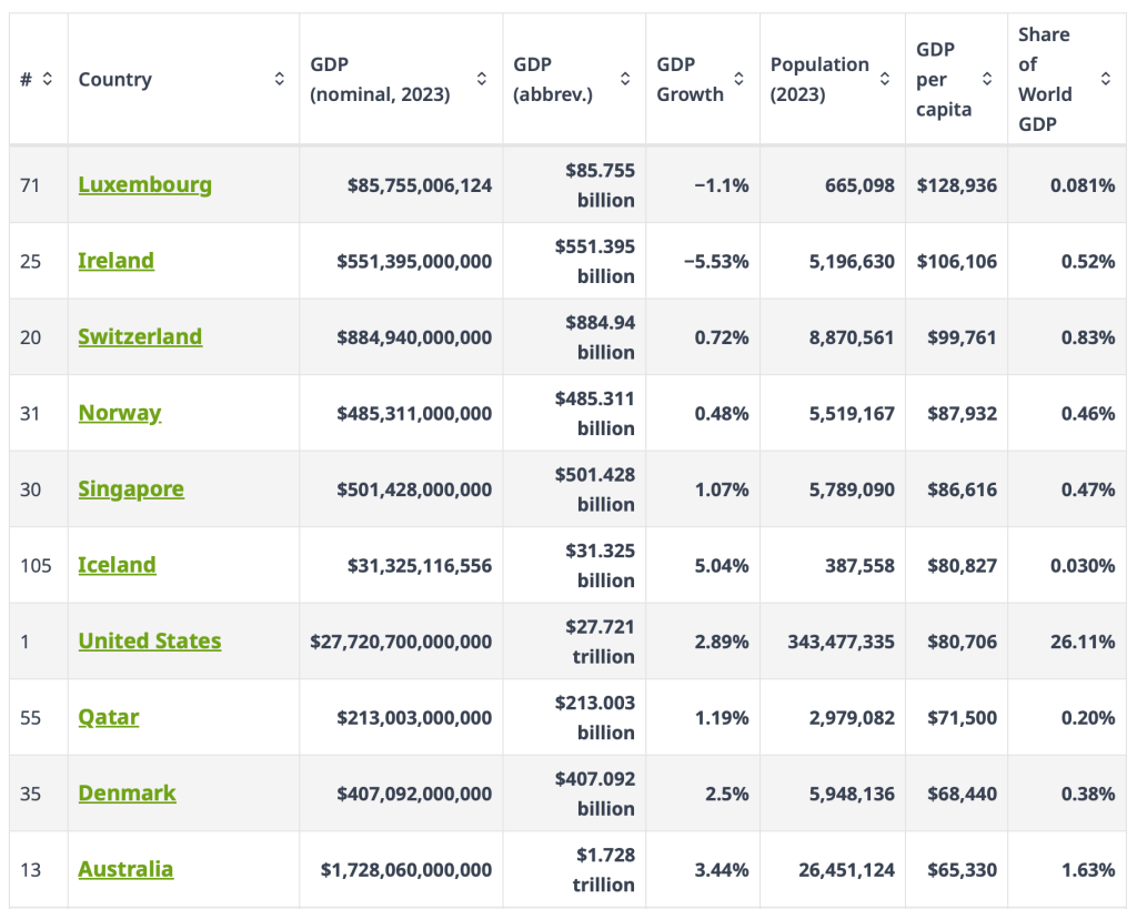 An even better measure is to look at GDP per capita. This takes the total GDP and divides it by the population (i.e., economic input generated per person on average). Here are the top ten. BTW, GDP per capita gives an even better understanding of national economic health. US per capita GDP was $80,706 in 2023 while China’s was $12,509. It is one of the reasons people should understand that, as vast and powerful as China is, the US is far wealthier and more powerful.