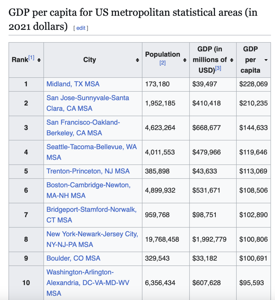 Before anyone has a sad about the US being 7th on this list, consider the degree to which looking at very small population countries ahead of us on this list, especially in what amounts to city-states in some of these cases. For further context, let’s look at GDP per capita in US metropolitan areas (source: Wikipedia).