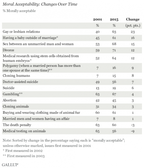 A new Gallup poll seems to be the strongest indication yet that Americans have become much more accepting of things that used to be considered “taboo” than they used to be in the past: