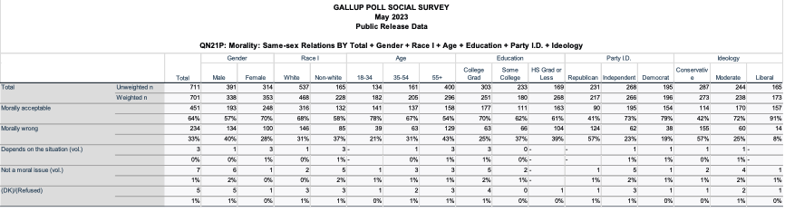 I think that last graph you show (same sex relations) explains it – Republican media and politicians like DeSantis are working hard recently energizing “Conservatives” about anti-LGBTQ+ thinking, and people who listen to them are responding.