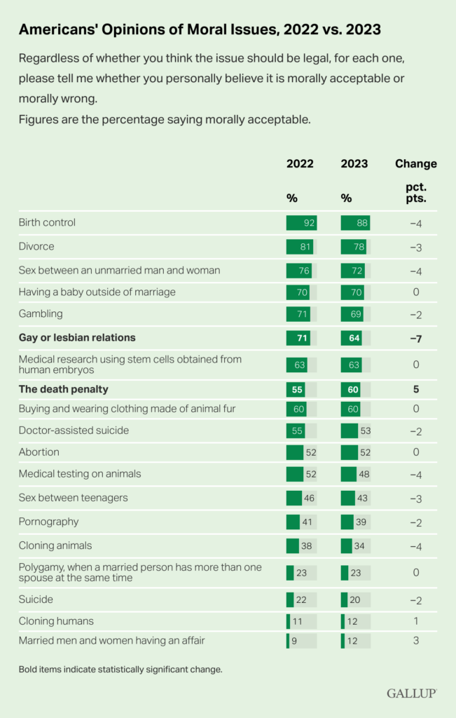 Americans are most likely to say birth control is morally acceptable, with 88% holding that view. At least seven in 10 say the same about divorce, sex between an unmarried man and woman, and having a baby outside of marriage. Same-sex relations and the death penalty are in the next group, along with gambling, stem cell research and wearing animal fur, with between 60% and 69% of Americans approving of those five issues from a moral perspective.