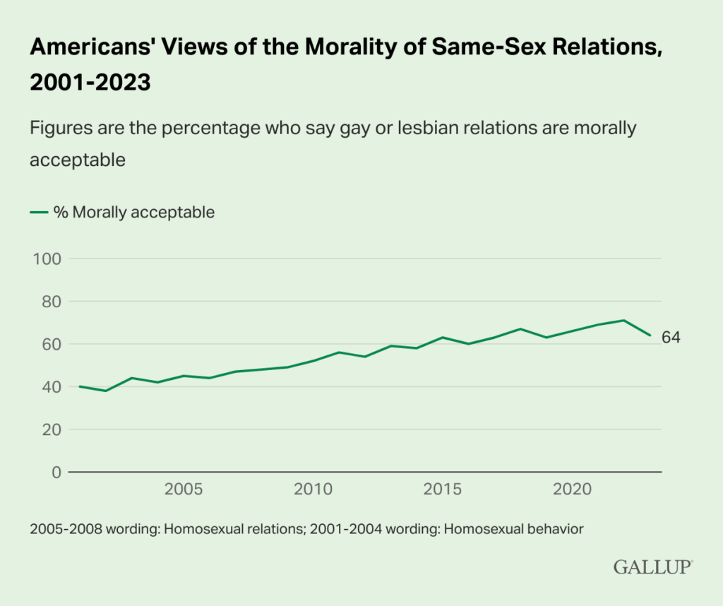 Gallup’s Jeffrey M. Jones (“Fewer in U.S. Say Same-Sex Relations Morally Acceptable“):