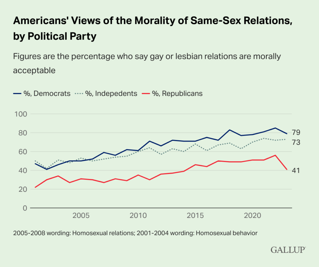 Democrats (79%) and independents (73%) continue to be much more likely than Republicans to find gay or lesbian relations morally acceptable.