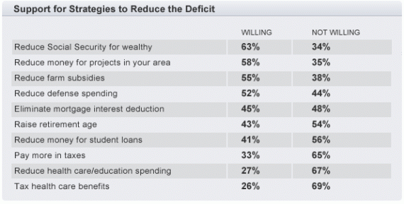 This is not at all helpful to a reasoned discussion of how we are going to deal with Federal spending.  Even if the top three spending categories were eliminated entirely, they would make virtually no dent at all in the Budget Deficit. The one good sign is that there appears to be public acceptance of the idea that military spending is on the table, although even there significant reductions in the $ 700 billion we spend every year on defense unless we start rethinking our role in the world and whether we really do want to continue to be the world’s policeman. And the good news ends there. Two of the biggest line items in the Federal Budget are Medicare and Social Security (and yes, I know that SSI is technically independent of the Federal Budget, but it’s being funded with IOUs from the Federal Budget), and only 1 in 5 Americans are willing to consider cuts.