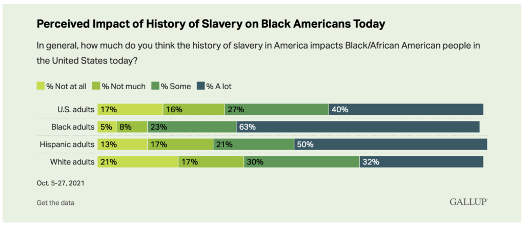 This is largely positive, but some of the specific numbers point out that while a majority holds these views, the minority that does is not small. The most telling is that only 32% of white adults in the survey think that slavery impacts Blacks “a lot” today versus 63% of Black adults. Now, in fairness, a majority (62%) of whites think slavery matters a combined “some” and “a lot”–but that still leave a large minority of whites who think that slavery had no impact, or “not much” and since whites make up the majority of the population, those views heavily affect the overall numbers.