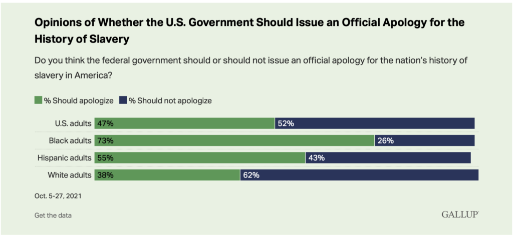 But it is telling that something as simple as a formal apology for slavery (back to the Gallup poll) is an issue that most Americans, and a large majority of white Americans, oppose: