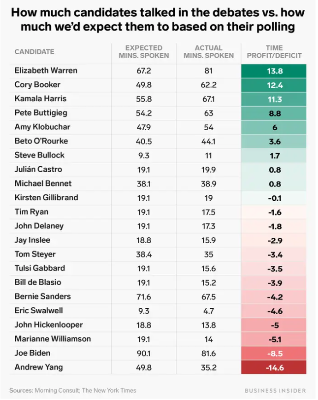 In another examination of debate speaking time that includes all five of the Democratic debates, Business Insider compares the actual amount of time that candidates have received compared to what would be expected given their position in the polls: