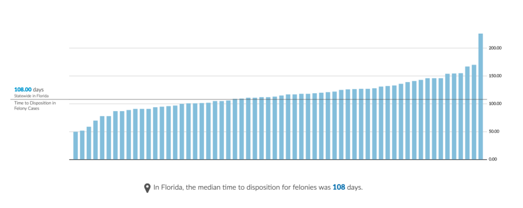 Often states do set policies about how long the “average” case should take. So for example, Florida stipulates that felonies that go to trial should be resolved within 180 days (90 days for misdemeanors). That’s in keeping with the guidelines that the National Center of State Courts has published. Unfortunately, because of the opaqueness of criminal legal system data in the US, it’s difficult to quantify how long things actually take. Depending on the structure of a state’s courts and how they collect and publicize their data, the number may or may not be able to be calculated. Even though Flordia has some of the best transparency laws in the country, it’s still exceedingly hard to separate plea bargains from jury verdicts**. My former employer, Measures For Justice, has done important work in the area of data transparency. And while they were not able to disambiguate pleas from trials, they were at least able to show that the average time to resolution for a felony in Florida is 108 days***. As you see below that does vary from county to county for that data set.