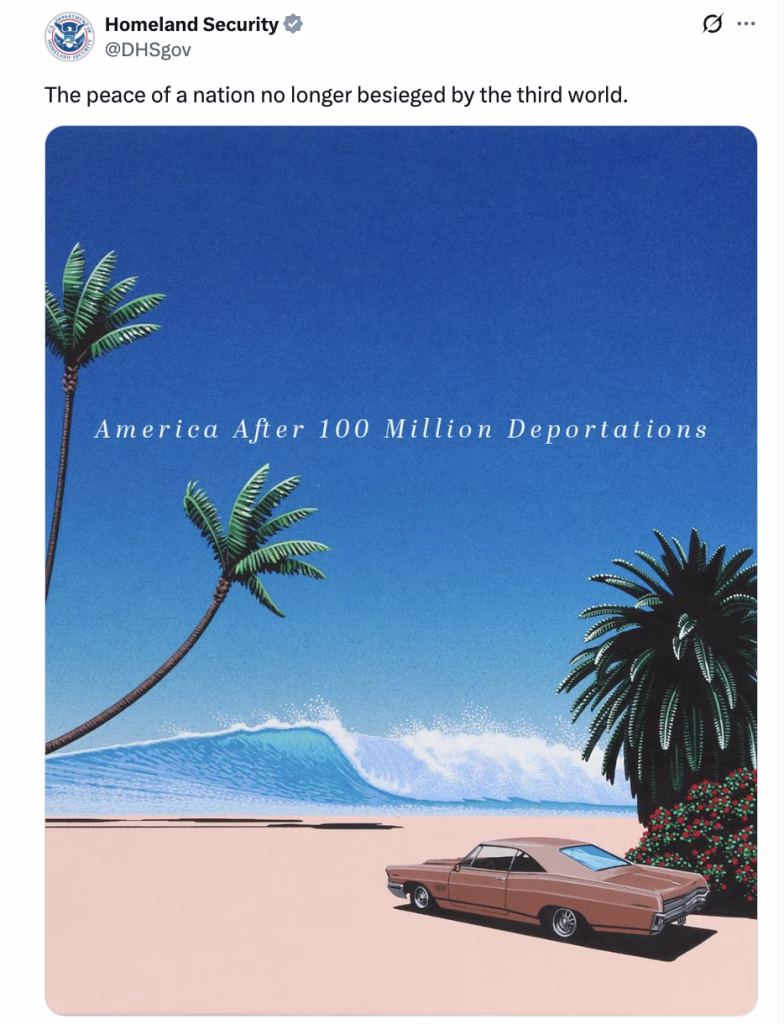 To add to all of this, the artwork is by a Japanese artist who certainly did not give DHS permission to use it (although the degree to which he would have to for a post like this is unclear). Regardless, like using the sons of immigrants for some purity propaganda, this is just yet again an example of people who supposedly think that some version of “real” Americans are the apex of development, continually demonstrating turning to the art output of the dreaded “other.”
