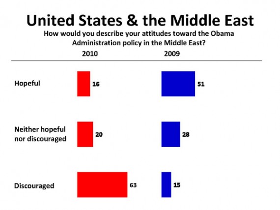 Among the most striking findings on the question of attitudes toward President Obama: Early in the Obama administration, in April and May 2009, 51% of the respondents in the six countries expressed optimism about American policy in the Middle East. In the 2010 poll, only 16% were hopeful, while a majority – 63% – was discouraged.