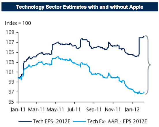 Joe Weisenthal, whose Money Game blog at Business Insider is a recommended follow by the way, passes along this of earnings in the technology sector both with and without Apple factored into the equation: