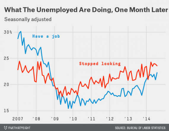 Another concern is the fact that we may never actually recover from the losses that we suffered during the recession and the long, slow recovery. Many of the people that lost their jobs during this period seem to have simply given up looking for work altogether, a fact that is demonstrated most starkly in the fact that the Labor Force Participation Rate remains at rates that we last saw during the recessions of the late 1970s and early 1980s. To some extent, this drop off can be attributed to the fact that Baby Boomers are retiring, but that simply cannot account for all of the people who have given up looking for work and, as this chart that Ben Casselman shared on Twitter this morning shows, August was the 49th month of the past 50 in which the number of people who dropped out of the labor force exceeded the number looking for work: