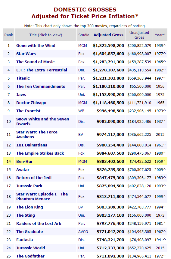 Here’s how Box Office Mojo ranks the blockbusters of the past and present after adjusting for inflation. The list includes some 300 movies but I’ll post just the top 25: