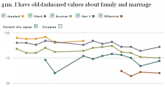 On the question “I have old-fashioned values about family and marriage,” those who agree increase with each generation.