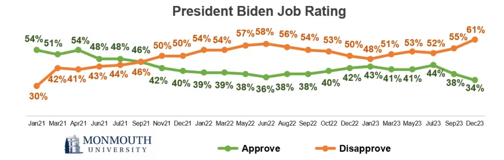 Public opinion of Biden’s overall job performance currently stands at 34% approve and 61% disapprove – his lowest rating in Monmouth’s polling since he took office. Since September, his approval number has dropped 4 points and his disapproval number has increased by 6 points. Between October 2022 and July 2023, Biden’s approval rating ranged between 40% and 44% while his disapproval number registered between 48% and 53%. Presidential approval has dropped among both Democrats (74%, down from 80% in September and 88% in July) and independents (24%, down from 30% in September and 38% in July); and it currently stands at just 5% among Republicans.