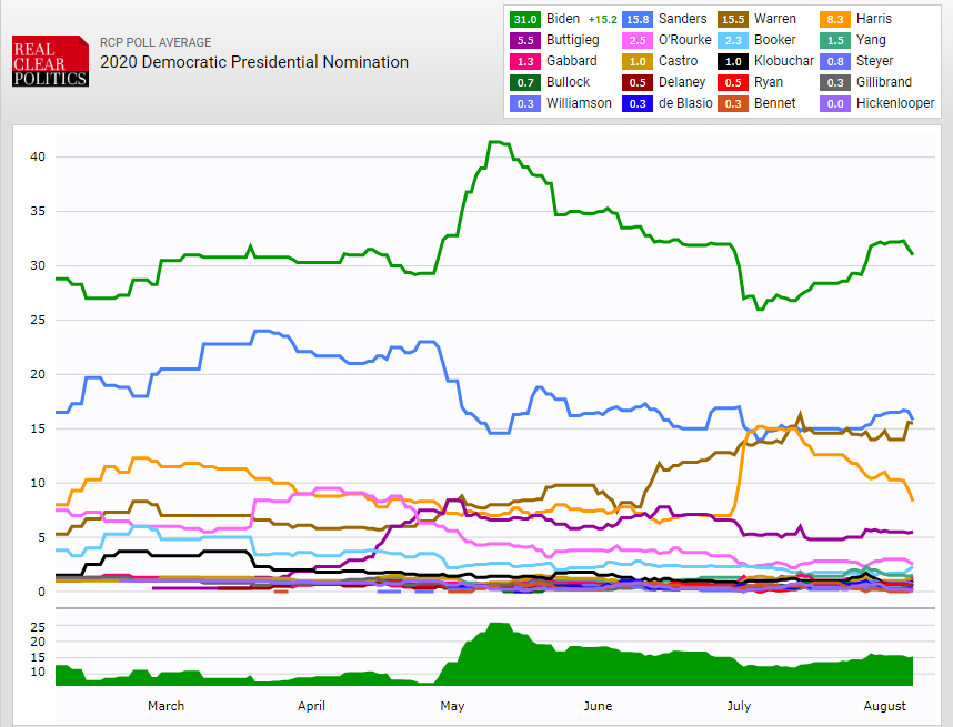 Moving on to the RealClearPolitics polling average, we find that Biden remains in the lead while Sanders is slowly slipping into third place behind Warren: