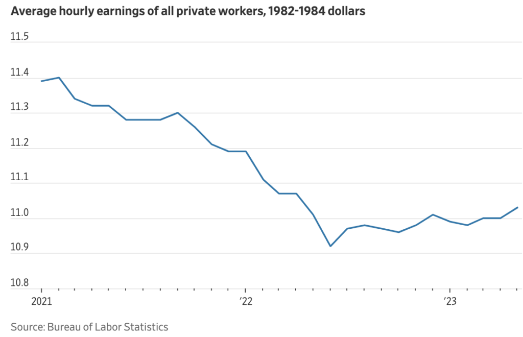 In 1982-84 dollars, which takes account of inflation, average hourly earnings were $11.39 when Mr. Biden took office but started to decline immediately and didn’t stop falling until inflation peaked in June 2022. They have bounced up a little but were still back only to $11.03 in May. That’s a 3.16% decline in real earnings for the average worker across the 29 months of the Biden Presidency.