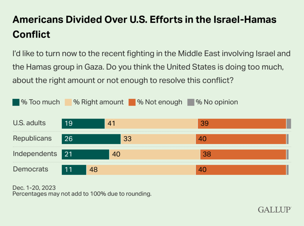 Americans who agree said response has indeed gone too far — and who include swaths of the entire ideological spectrum as indicated by the polling graph above — are not necessarily anti-Israel.