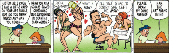 He said he knew that in my strip, I frequently make fun of my own art skills. And that he thought it would be funny to have me get hit on the head or something and suddenly be able to draw. Then he’d step in and draw my comic strip for a few days.
