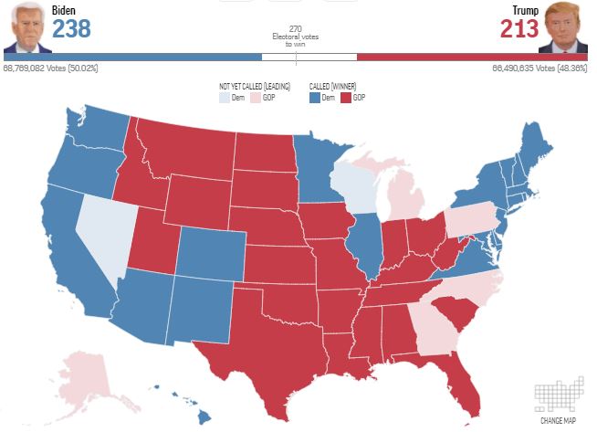 The two candidates, who have proposed dramatically different visions for the nation, split territory across the U.S. after polls closed Tuesday night. With neither candidate securing the 270 Electoral College votes needed to win the White House, Biden urged patience and vowed that every vote would be counted.