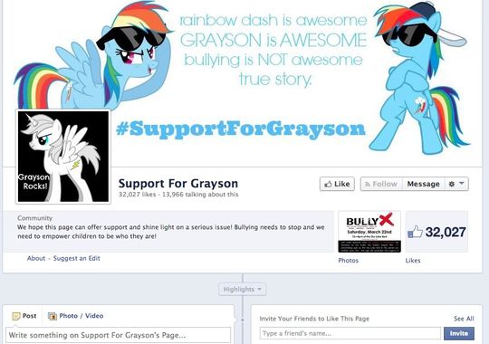 Thousands of followers from around the world posted photos of My Little Pony memorabilia and supportive comments under the #SupportforGrayson hashtag on Facebook and Twitter. One of the television show’s creators, Lauren Faust, even weighed in on Twitter Tuesday, saying, “#standwithgrayson ’nuff said.”