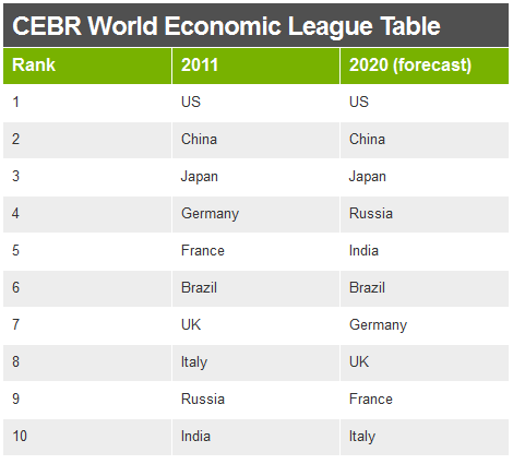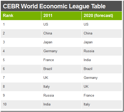 The piece also has the following rankings and projections, which underscores the rise of the BRIC countries: