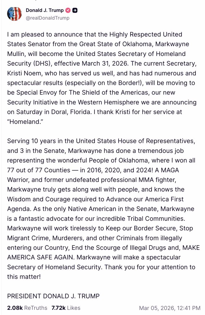 Via the NYT: Trump announces he is replacing Noem with Markwayne Mullin.