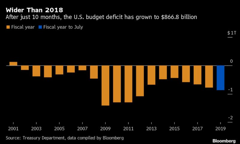 There are a number of factors driving the US deficit increase, including the $1.5 trillion tax cuts signed into law by Trump in 2017 along with a massive spending package passed by Congress.Tax revenue rose 3% to $2.86 trillion since the start of the fiscal year on October 1, but hasn’t kept up with increased federal spending, which increased 8%.