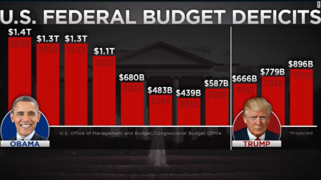 The graphic at the top of this post demonstrates the course that the budget deficit has taken under President’s Obama and Trump, as does this chart from Yahoo Finance, which shows the annual deficit dating back to 2001: