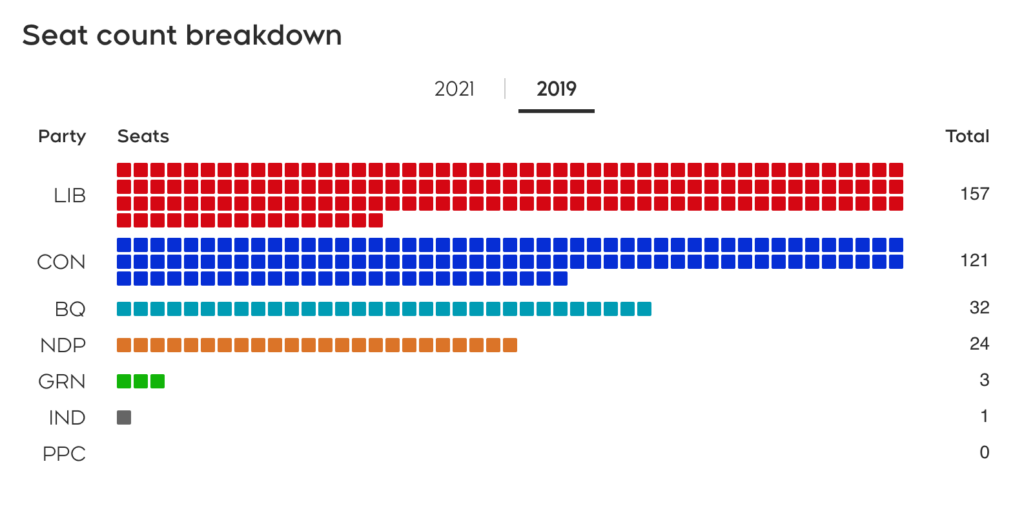 The problem in Canada is that the single-seat districts with FPTP, especially since they have a lot of parties (which, BTW, is an example of why Duverger’s Law isn’t much of a law)** produces outcomes wherein the party with the most votes does not win the most seats.