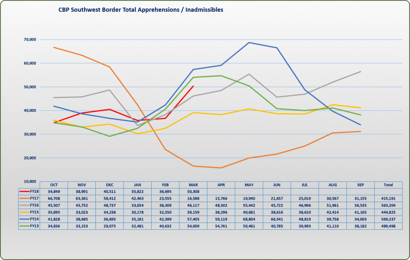 The orange line represents border apprehensions in the previous Fiscal year, which ended on September 30, 2017, while the red line represents apprehensions in the current year through March. While the data does show apprehensions have gone up in the months since October 2017, those numbers are not appreciably higher than where they’ve been since the beginning of President Obama’s second term. In other words, there is no “immigration crisis” at the southern border, except for the one that exists in the mind of the President of the United States, which seems to mostly take its cues from the “information” it absorbs from Fox News Channel.