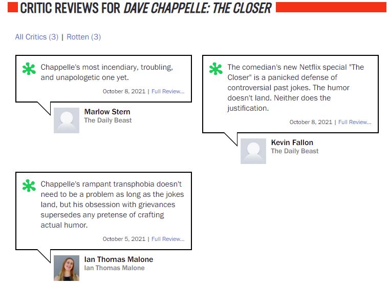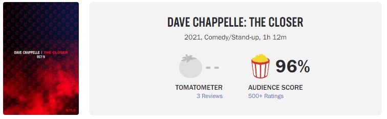 As with most of the Netflix drops, this one has been quite controversial because of the funny-not-funny commentary on social issues, particularly his comparisons between the transgender and Black experiences. The Rotten Tomatoes reviews show something interesting, indeed: