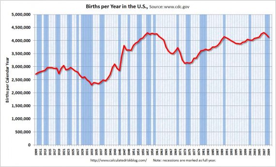 The NCHS reports that U.S. births declined to 4.136 million in 2009, from 4.247 million in 2008. The birth rate declined to 13.5 from 13.9 in 2008 (births per 1000 total population).