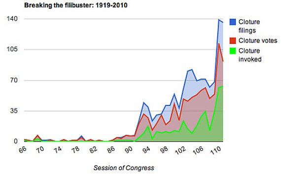 - The filibuster rules have changed a few times during the period covered by this chart. It used to be the case that 67 votes were needed to break a filibuster, then the number was reduced to 65, and then to the current level of 60 in the 1970s
