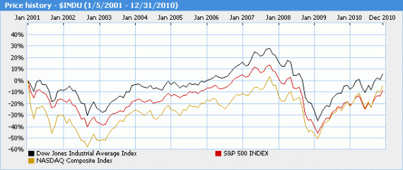 Take a look at this chart of the Dow Jones Industrial Average, the Standard & Poor’s 500, and the NASDAQ index for the ten year period that just ended: