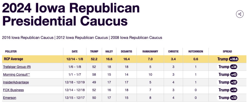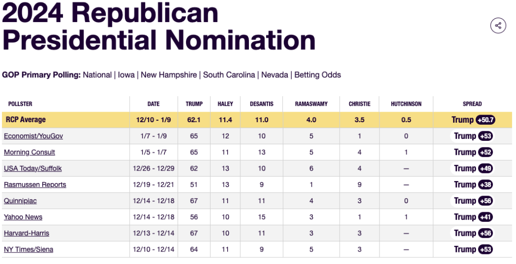 Trump is averaging a 51.2% lead over Haley, his nearest challenger. Even if she picked up all of Christie’s 3.3%, it doesn’t matter.