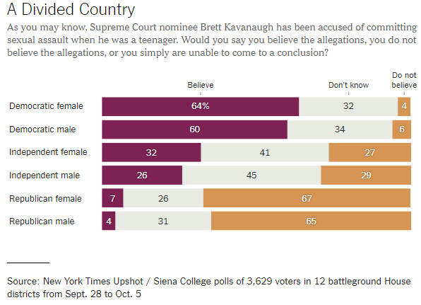 My Democratic-leaning Twitter feed (mostly national security and media elites) is overwhelmingly apoplectic about the way Senate Republicans treated the sexual assault allegations against Kavanaugh. My Republican-leaning Facebook feed (mostly acquaintances from my high school and Army days, but also a lot of people I met in the early days of OTB, when it was much more Republican) are angry at the way Democrats handled the information and completely outraged that a good man’s reputation has been dragged through the mud to suit a partisan agenda.