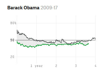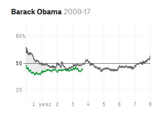 Let’s look at Obama’s first term (via 538, and the green line is Trump’s approval up to the time of this post)::
